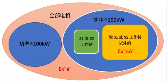 3. 對鼠籠轉子的要求,增安型電機均需對照GB3836.3-2010表4《對于鼠籠轉子點燃危險因數(shù)的潛在的氣隙火花危險評價》進行評定,而對于無火花型電機而言,只有額定輸出大于100kW、S1或S2工作制除外的電機才需依照 GB3836.8-2014 表6《鼠籠轉子點燃危險因數(shù)的潛在氣隙火花危險評價》進行評定(區(qū)別見圖1),進而決定是否需要采取額外措施以保證電機起動和運行時不會發(fā)生引爆。