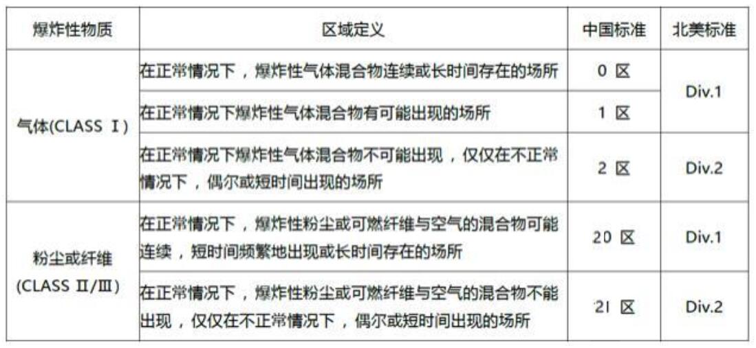 美國和加拿大首先將散布在空氣中的爆 炸性物體分成三個 CLASS( 類別 ):CLASS Ⅰ氣體和蒸氣 ; CLASS Ⅱ 塵埃 ; CLASS Ⅲ纖維 . 然后再將氣體和塵埃分成 Group( 組 ) :
